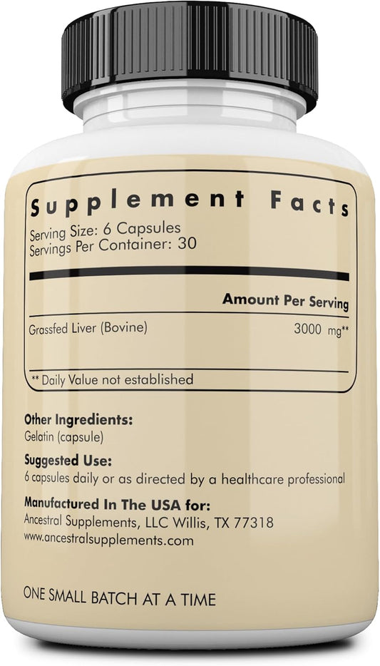 Ancestral Supplements Grass Fed Beef Liver 180 Capsules, Supports Energy Production, Detoxification, Digestion, Immunity and Full Body Wellness, Non-GMO, Freeze Dried Liver Health Supplement