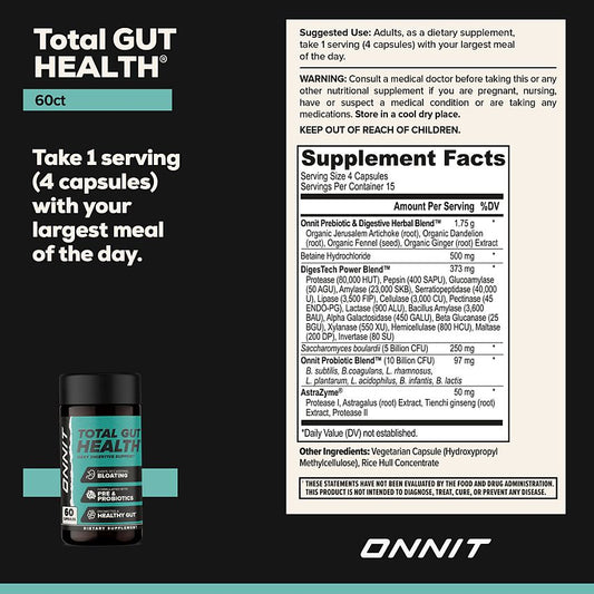 Onnit Labs|Total Gut Health|Daily Digestive Support with Prebiotics & Probiotics-(60 Capsules)