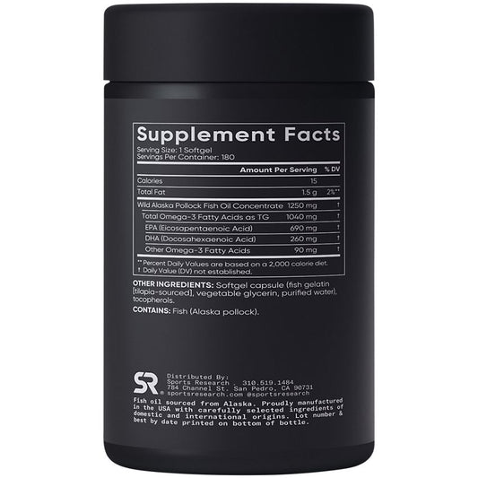 Sports Research Corporation|Triple Strength Omega-3 Fish Oil|Superior Triglyceride Form -1,250 MG (180 Softgels)